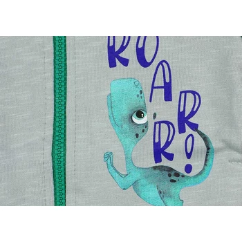 Egy igazán vidám és játékos választás a kis fiúknak, ez a szürke színű, dinós mintával díszített cipzáras pulóver. A pulóver kiváló minőségű, 100% pamut alapanyagból készült Magyarországon, így garantáltan bőrbarát és kényelmes viseletet biztosít. A pulóver rugalmas, vékony anyagának köszönhetően tökéletesen illeszkedik a kisfiúk mozgékony életstílusához. A derék és ujj részénél lévő passzé biztosítja a tökéletes illeszkedést, míg a cipzáros állvédő extra védelmet nyújt a hideg időben. A pulóveren található zsebek praktikusak és stílusosak. Könnyen kezelhető, jól mosható, szín- és formaálló, így hosszú ideig megőrzi szépségét. Minőségi magyar termék, mely minden kisfiú gardróbjának elengedhetetlen darabja lehet.