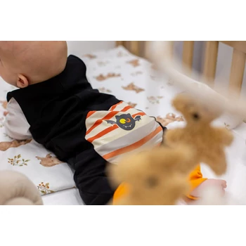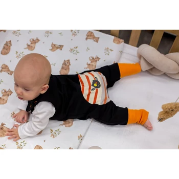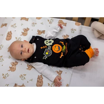 A Halloween ujjatlan rugdalózó 2:1 méretben az igazi kis ördögöcskéknek készült! Ebben a fekete, Halloween-es mintával nyomott, cuki fenék foltos kis ruhában a babád mindenkit elkápráztat majd! Az állítható kantáros kialakításnak köszönhetően tökéletesen illeszkedik a kicsi testéhez, a lábszárnál felhajtható passzé pedig extra kényelmet biztosít. Minőségi magyar termék, amely garantáltan ellenáll a mindennapos használatnak és a gyakori mosásoknak. Anyaga 90% pamut és 10% elasztán, így a baba bőre szabadon lélegezhet, miközben a rugdalózó formáját megtartja. Nikkelmentes patenttal készül, így az erre érzékeny babák esetében sem vált ki allergiás reakciót. Készítsd fel a kicsit az ünnepekre ezzel az aranyos Halloweenes rugdalózóval!