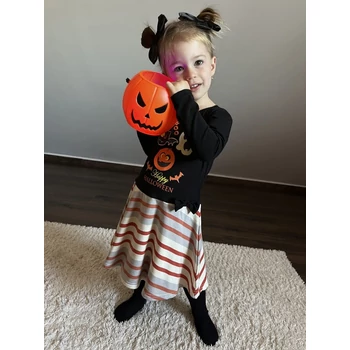 Szívdobogtatóan cuki, Halloween ihlette kislány ruha, amely a tökéletes választás a szellemes ünnepre! A ruha fekete színű, melyet vidám, tündéri szellemek díszítenek. Az alja csíkos, ami tovább fokozza a ruha játékos jellegét. Az elasztikus pamutból készült ruha nagyon kényelmes viselet, így a kislányok egész nap szabadon mozoghatnak benne, legyen szó akár a Halloween-i buliról, akár a mindennapi játékról. A minőségi magyar termék garantáltan tartós és strapabíró, hiszen első osztályú anyagból, 95% pamut és 5% elasztán felhasználásával készült. Tartsd a szellemes hangulatot a hétköznapokban is ezzel a bájos ruhával! |