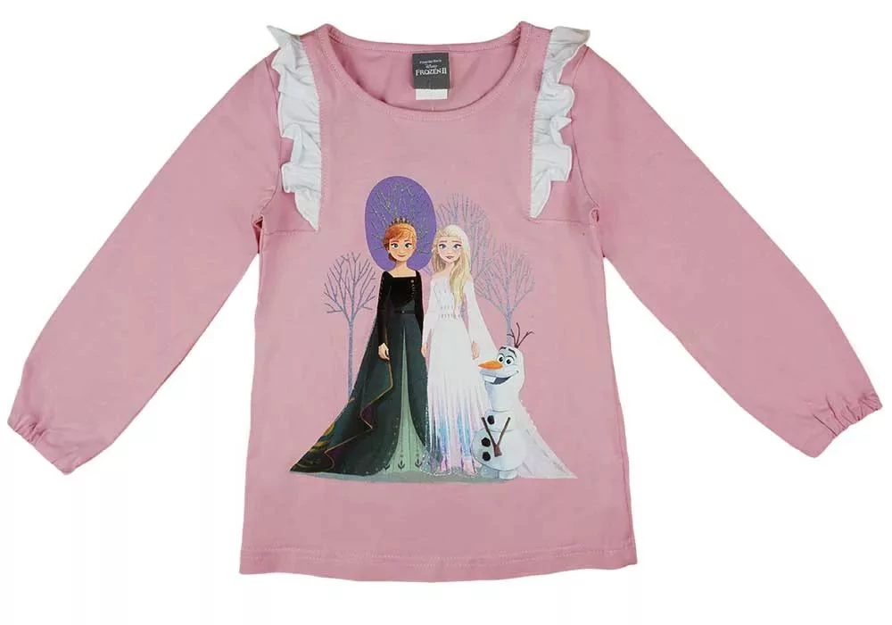 Disney Frozen, Jégvarázs gyerek fodrokkal díszített hosszú ujjú tunika. A gyerek póló finom tapintású, kényelmes pamut anyagból készült, mintázata anyagba nyomott, tartós nyomású. A hosszú ujjú lányka tunikán Elsa és Anna királynő mintája részletgazdagon kidolgozott, jégvarázs mozifilmek motívumaival díszítve. Eredeti Disney ruházat, magyar termék.