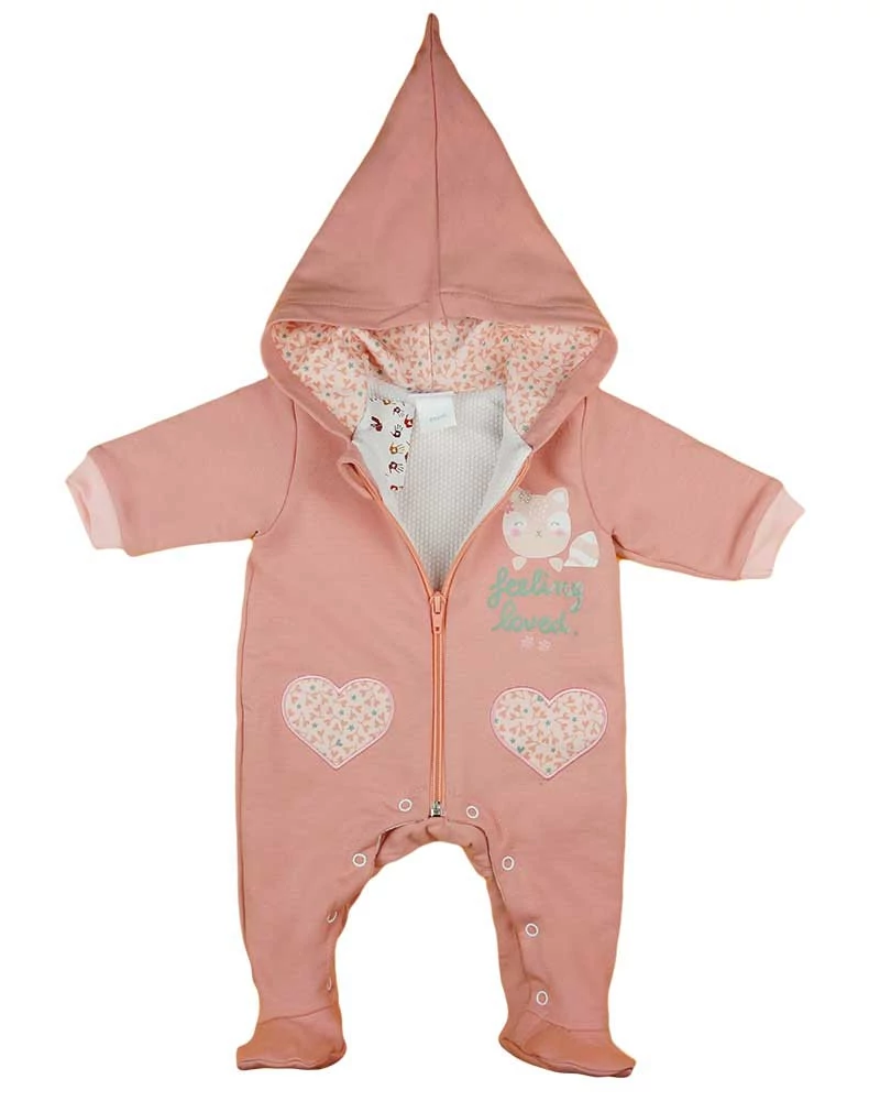 A legcukibb kapucnis baba overál, amit valaha láttál! Púder árnyalatú, cicás mintával nyomott design, ami minden kisgyermek arcára mosolyt csal. Elöl cipzárral, lábközött patenttal készült, így a baba öltöztetése egyszerű és gyors lesz. A belső oldalon puha 100% pamut bélés biztosítja a kényelmet és a meleget. 74-es mérettől felfelé a lábfej nélküli kialakításnak köszönhetően a baba szabadon mozoghat és játszhat anélkül, hogy beleszorulna. A minőségi magyar termék, amelyet az Andrea Kft. gyártott, 90% pamut és 10% elasztán anyagból készült, így biztosítva az overál rugalmasságát és tartósságát. A termék nikkelmentes patenttal készült, így az arra érzékeny babák sem fognak allergiás reakciót kiváltani. Minőség: I. osztály. Tökéletes választás a hidegebb napokra!