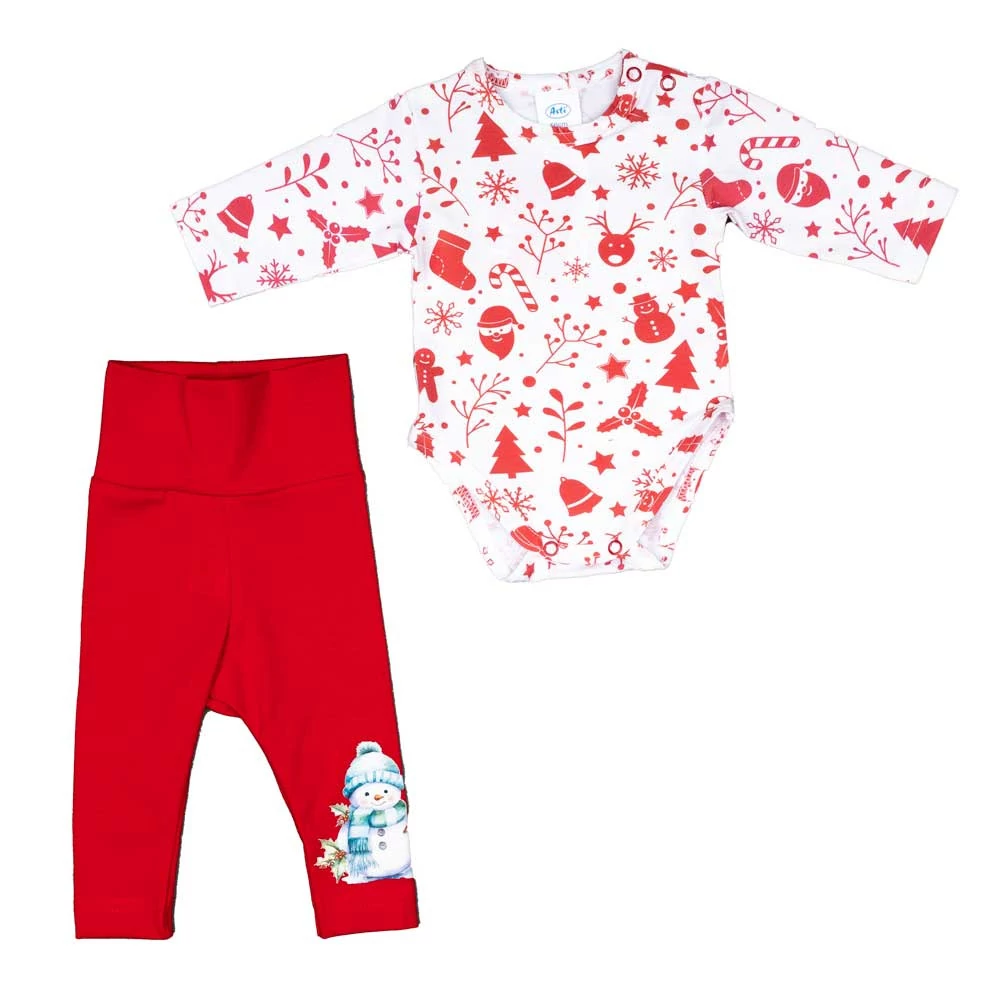 Karácsonyi 2 részes baba szett Ünnepelje karácsonyt ezzel a kétrészes baba szettel, aranyos karácsonyi mintával díszített fehér body, és a kényelmes baba nadrág igazán vagány és hangulatot kölcsönöz viselőjének. Mindkét darab finom pamut anyagból készült, a nadrág rugalmas pamutja pedig szabad mozgást biztosít a babának. A szett kiváló minőségű, jól mosható, szín- és formatartó anyaga miatt nemcsak a babák, de az anyukák kedvence is lesz! Ne csak a karácsony legyen különleges, varázsolja minden napot ünneppé ezzel a csodálatos babaszettel! A body 100% pamutból, a nadrág 90% pamutból és 10% elasztánból készült, ezáltal biztosítva a kiváló minőséget. A termék nikkelmentes patenttal készül, így az érzékeny babák sem fognak allergiás reakciót tapasztalni.