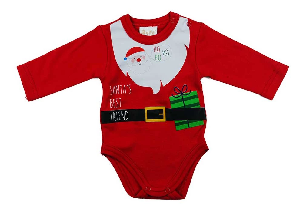 Ünnepelje a karácsonyi időszakot ezzel a cuki, hosszú ujjú, télapós mintával nyomott baba body-val! Piros színével és kedves mintájával garantáltan meghozza a karácsonyi hangulatot. A vállon elhelyezett nikkelmentes patentok segítségével könnyedén felvehető és levethető, így a pelenkázás is zökkenőmentes lesz. A minőségi, 100% pamut anyagból készült body garantálja a kényelmet és a puhaságot, mely a legérzékenyebb bababőrt is óvja. Készüljön fel a karácsonyi szezonra ezzel a magas minőségű, I. osztályú magyar termékkel, amely nem csupán gyönyörű, de allergiás reakciót sem vált ki a babáknál.