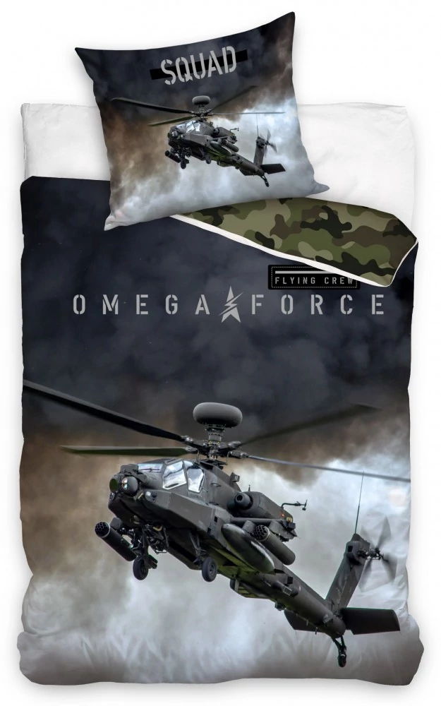 Pamut katonai helikopteres ágyneműhuzat, gyönyörű, részletesen kidolgozott mintával. Nagy alakban szerepel a nagy kedvenc mind a párnahuzaton, mind pedig a takarón.