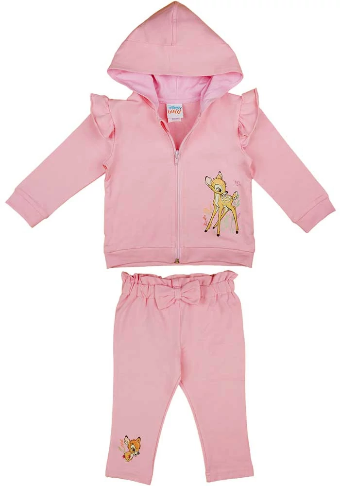 Kényeztesse kislányát ezzel a két darabos, Bambi mintás pamut szettel, amely a híres Disney rajzfilm hősnőjének, Bambinak a képét viseli. A szett rózsaszínű, éppen olyan cuki, mint a rajzfilm karakter. A szett egy kapucnis cipzáras felsőből és egy elegáns nadrágból áll, amelyek finom részletekkel, minőségi kidolgozással és visszafogott nyomással készültek. A fodrok, a vékonyított passzé kidolgozás és a szalagok eleganciát kölcsönöznek az összeállításnak. Az anyaga minőségi, enyhén elasztikus, vékonyabb pamut, amely szín- és formatartó, valamint jól bírja a mosást. A szett csinos, mégis sportos, jól variálható, és garantáltan a kislányok kedvence lesz. A termék 100% pamutból készült és I. osztályú minőséget képvisel.