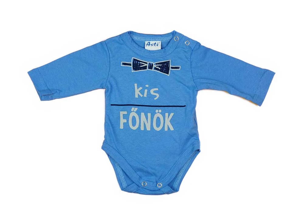 A "Kis főnök" feliratos hosszú ujjú baba body kiváló választás a kis parancsolgatók számára. A közép kék színű, vállon patentos kialakítású body igazán kényelmes viselet a babák számára, miközben stílusosan tükrözi karakterüket. A minőségi magyar termék 100% pamutból készült, így garantáltan puha és kényelmes viselet a babának, nem irritálja érzékeny bőrét. A body I. osztályú minőséget képvisel, amelyet a Magyarországon működő Andrea Kft. gyártott. A termékben található patentok nikkelmentesek, így azok nem okoznak allergiás reakciót a nikkelre érzékeny babáknál. Kérjük, vegye figyelembe a terméknél megadott életkort, amely csak irányadó jellegű.
