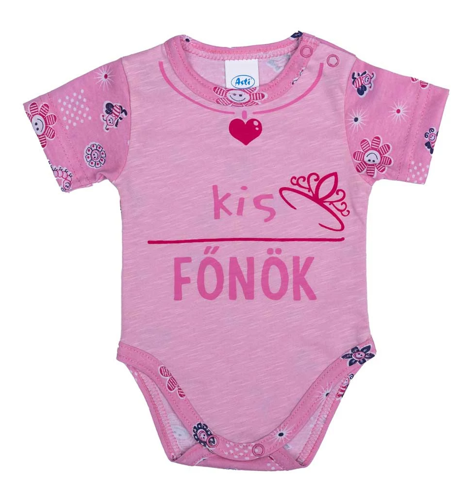 "Kis főnök" feliratos rövid ujjú baba body Ezzel a vállon patentos, virágos baba bodyval a kisbabád mindig stílusos lesz. A body feliratos, ami egyszerre vicces és aranyos. Az 100% pamut anyaga garantálja a kényelmet, és a nikkelmentes patentoknak köszönhetően nem kell aggódnod az allergiás reakciók miatt. Gondosan tervezett és készített termék, így biztos lehetsz benne, hogy a legjobbat kapod. A minőségi magyar termék, ami tökéletes választás minden unisex babáknak. Tökéletes választás, ha szeretnél egy igazán minőségi és kényelmes ruhadarabot a babádnak. Minőségi magyar termék Anyaga: 100% pamut, Minőség: I. osztály