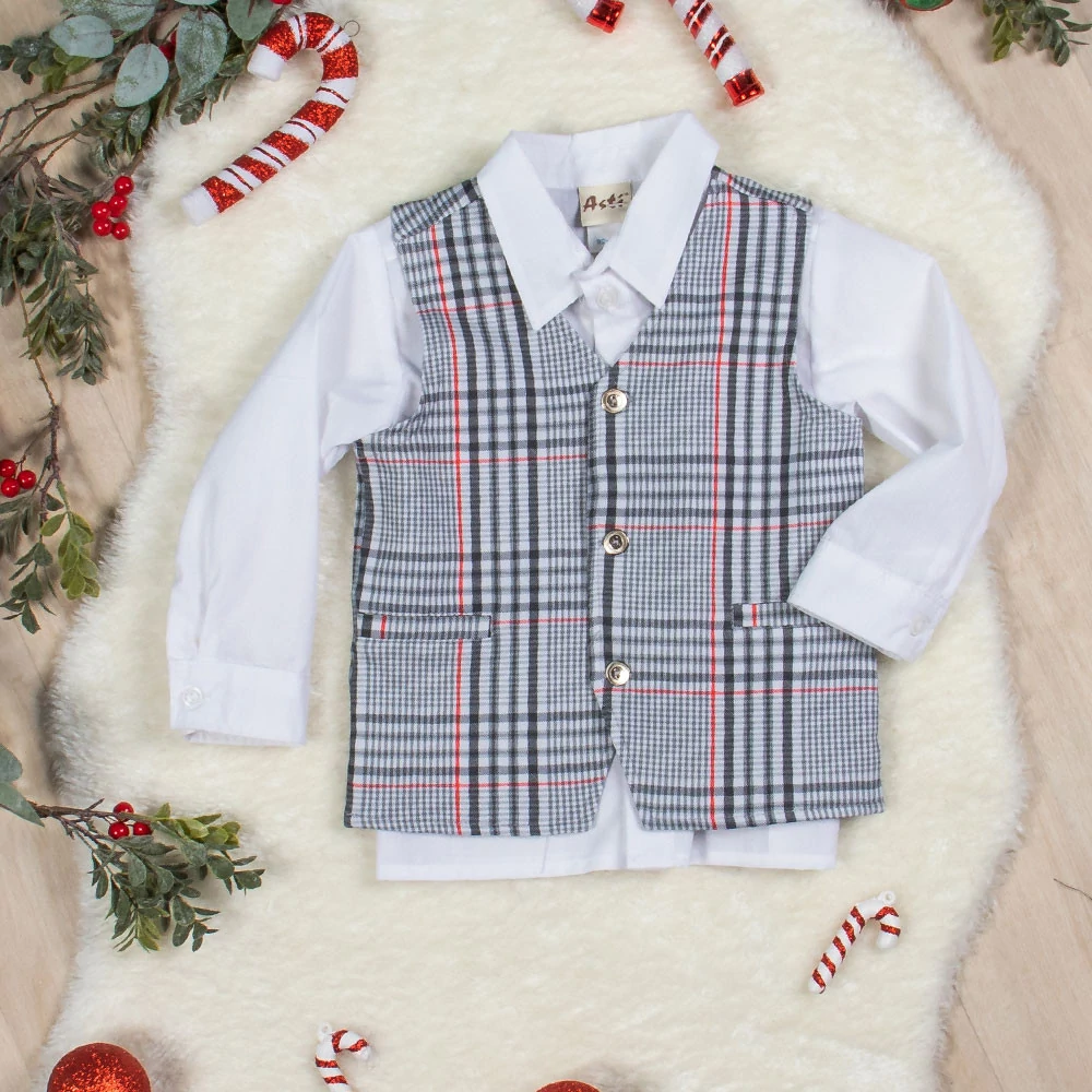 Öltöztesse fel kisfiát ezzel a stílusos, kockás alkalmi mellénnyel, amely tökéletes választás minden különleges alkalomra. A szürke színű, elöl gombos design elegáns megjelenést biztosít, míg a prémium minőségű, 90% pamut és 10% elasztán anyag garantálja a kényelmet és a tartósságot. A finom zsebekkel ellátott mellény még praktikusabbá teszik, így fiának mindig lesz helye a kis kincsei számára. Büszkén gyártva Magyarországon, az Andrea Kft. által, ez a mellény nem csak stílusos, de minőségi választás is. Ragyogjon a kisfiú a következő családi eseményen ezzel a kiváló minőségű, magyar termékkel.