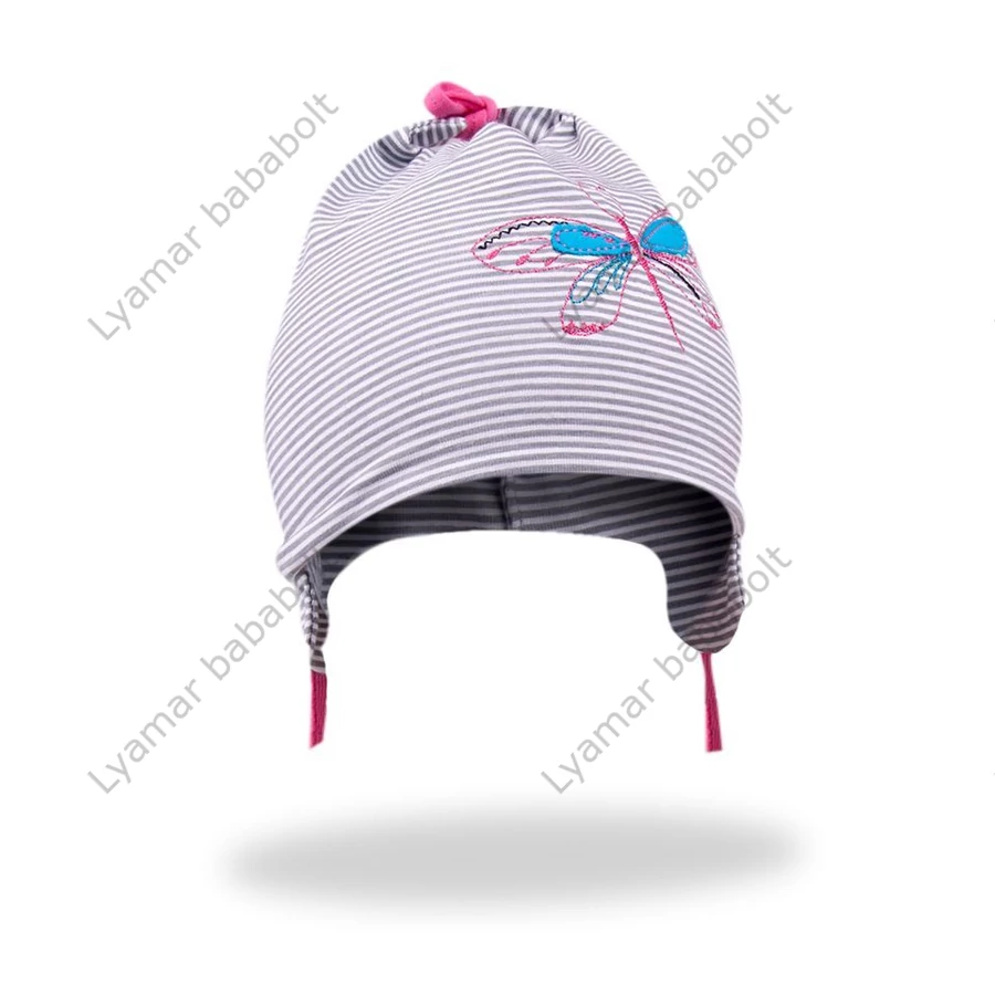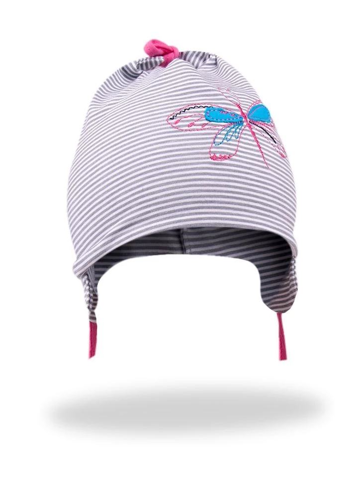 Füles, kötős pamut sapka (Méret:42-44 cm), igazán szép szitakötős figurával díszítve. Kényelmes viselet.