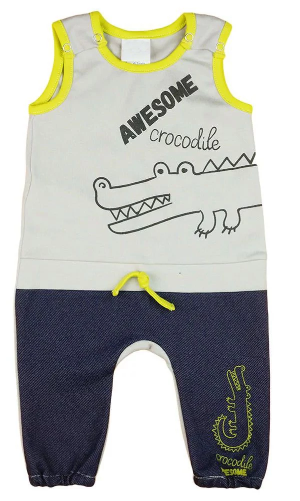 Krokodilos ujjatlan rugdalózó. A baba ujjatlan rugdalózó finom bőrbarát pamut anyagból készült, mintája anyagba nyomott, tartós, krokodilt ábrázol. Lábszárán gumis rész akadályozza meg a rugdalózó "felcsúszását". A könnyű öltöztetést elősegítendően az ujjatlan rugdalózó vállon patentos. A termék nem tartalmaz nikkelt, az ujjatlan rugdalózónál használt patentok nikkelmentesek, így nem okoznak allergiás reakciót az arra érzékeny babáknál. Magyar termék.