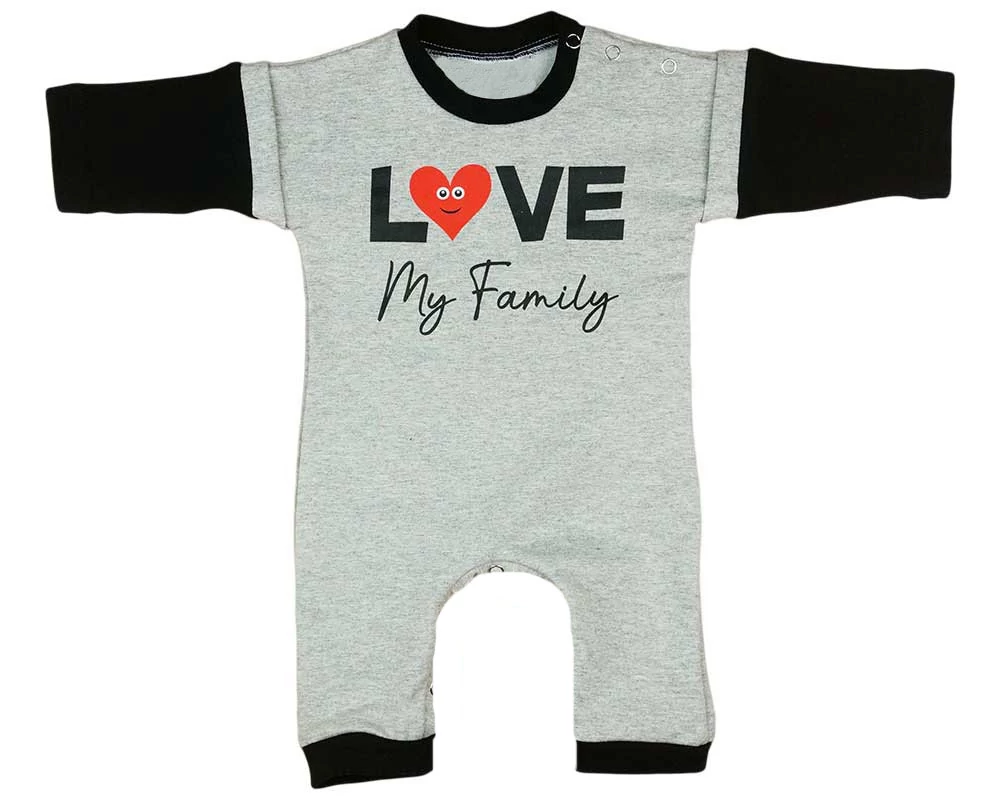 Love My Family feliratos hosszú ujjú rugdalózó. A hosszu ujjú feliratos baba rugdalózó anyaga 100% pamut, mintája anyagba nyomott, tartós. A könnyű öltöztetést elősegítendően a hosszú ujjú rugdalózó vállon patentos. A termék nem tartalmaz nikkelt, az ujjatlan rugdalózónál használt patentok nikkelmentesek, így nem okoznak allergiás reakciót az arra érzékeny babáknál. Magyar termék.