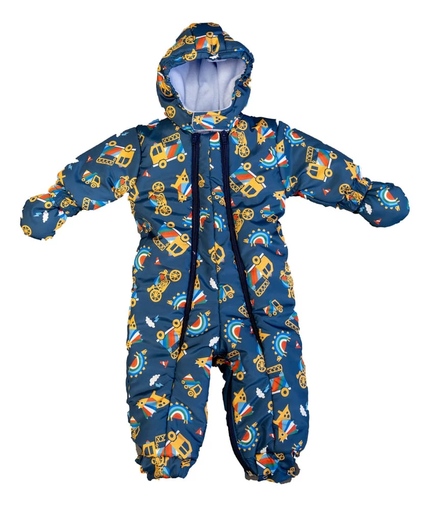 Egy igazán stílusos és praktikus választás a hideg hónapokra, ez cuki Jármű mintás kapucnis overál. Az overál különlegessége, hogy bundazsákká alakítható, így a hideg téli napokon is tökéletesen megóvja a kicsiket a fagyos időtől. A vízlepergetős anyaga pedig biztosítja, hogy a hó és az eső sem árthat a kis játszadozóknak. A bélése a kényelmet és a meleget biztosítja. Az elöl található cipzár segítségével könnyedén bele tudja helyezni a babát, valamint a lábrész szétnyitható kialakítása révén a baba mozgását sem gátolja. Mindezek mellett cuki mintája teszi igazán divatossá és aranyossá ezt az overált. Tökéletes választás azok számára, akik nem akarnak kompromisszumot kötni a stílus és a kényelem között.
