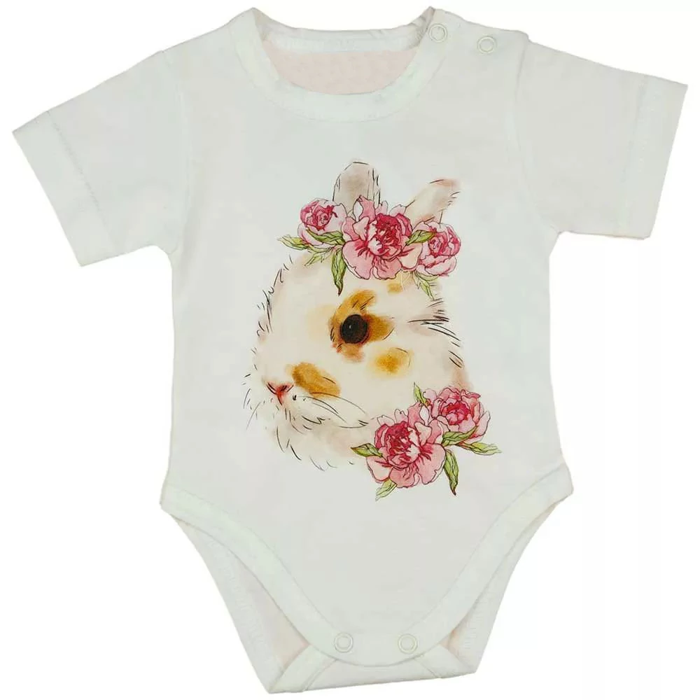 Nyuszi mintás rövid ujjú pamut body. Rövid ujjú kislány kombidressz, könnyen kezelhető 100% baba barát pamutból készült, praktikus és kényelmes alapdarabja a kisbaba ruhatárának. A pamut body a mese jellegzetes figuráját eleveníti meg. Nyuszi rajongók ruhatárának kihagyhatatlan darabja. Magyar termék.