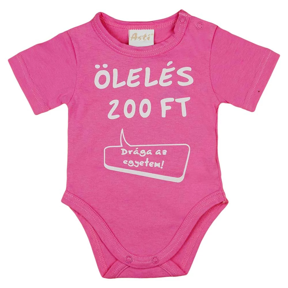 "Ölelés 200 Ft" felirattal nyomott, vállon patentos rövid ujjú baba body, kombidressz.