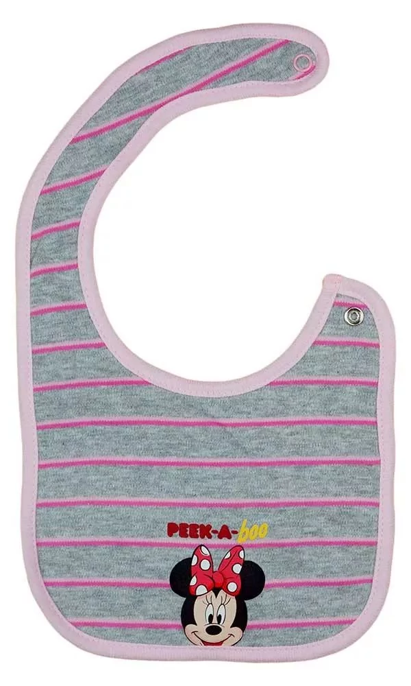 Disney Minnie pamut patentos baba előke. A baba előke nikkelmentes patenttal készült, ezért nem vált ki allergiás reakciót az arra érzékeny babáknál.