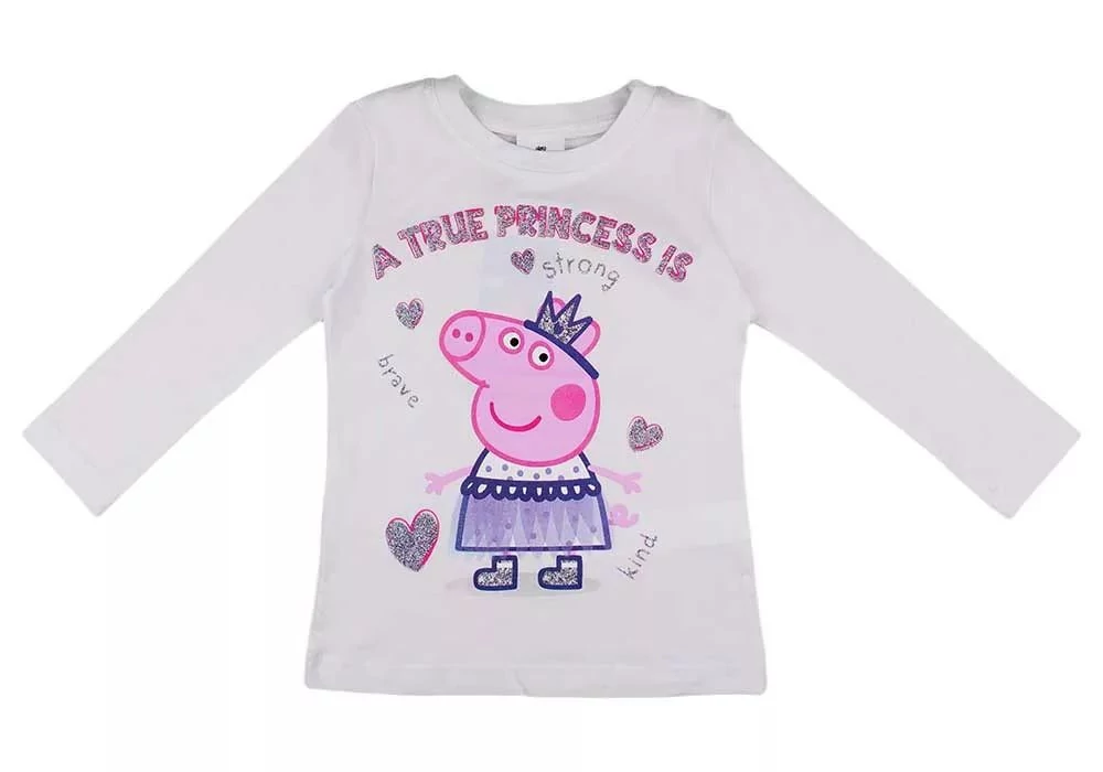 Peppa Malac gyerek hosszú ujjú póló, felső. A gyerek póló, felső finom tapintású, kényelmes pamut anyagból készült, mintázata anyagba nyomott, tartós nyomású. A hosszú ujjú lányka pólón Peppa malac részletgazdagon kidolgozott mintája szerepel. Magyar termék.
