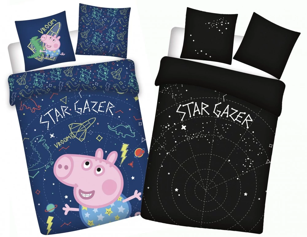 - Minta: Peppa Malac Star-Gazer / Csillagfigyelő – egyik oldalon vidám, színes űrkaland Peppával, másik oldalon sötétben világító csillagkép. Kétoldalas dizájn.