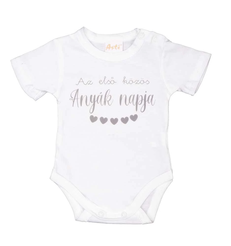 Rövid ujjú Anyák napi baba body Egy igazán aranyos választás a Anyák napjára. Képzelj el kisbabáját ebben a fehér, rövid ujjú baba bodyban, melyen "Az első közös Anyák napja" felirat olvasható. Kiváló minőségű, magyar termék, amelyben garantáltan jól érzi magát a kicsi. A vállán található patentos kialakítás miatt könnyedén fel- és leöltöztethető, ami a mindennapokban nagy segítség. Az anyaga 100% pamut, így kényelmes és bőrbarát viselet a babáknak. A termék nikkelmentes patenttal készül, így az arra érzékeny babák is nyugodtan viselhetik, nem vált ki allergiás reakciót. Egy igazán különleges és szívhez szóló ajándék lehet a legkisebbeknek Anyák napján. Minőségi magyar termék Anyaga: 100% pamut Minőség: I. osztály