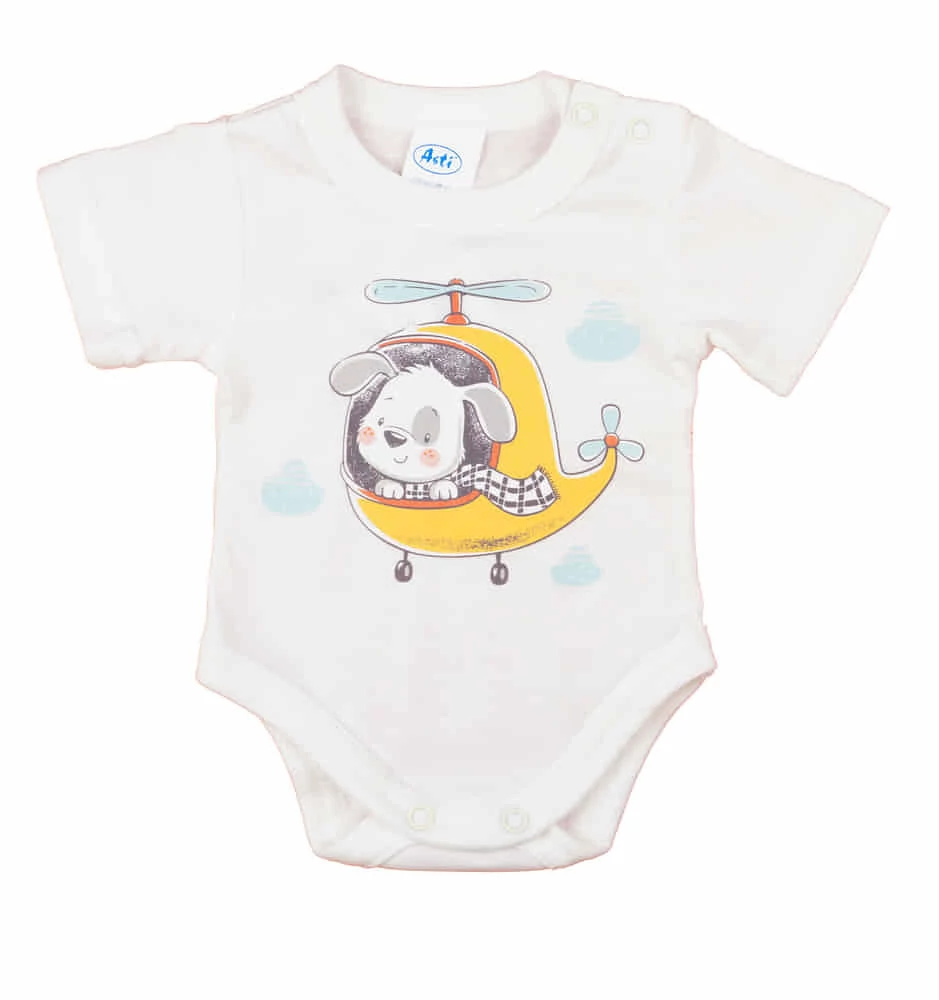 A rövid ujjú baba body igazi alapdarabja lesz kisbabája gardróbjának, mely a legkülönbözőbb darabokkal is könnyen kombinálható. Az elején található cuki helikopteres minta igazi játékosságot hoz a mindennapi öltözködésbe, garantáltan minden kis repülőrajongó kedvence lesz! A minőségi magyar termék 100% pamutból készült, amely kiválóan bánik a picik érzékeny bőrével, nem okoz irritációt, mégis könnyen tisztítható és tartós használatot biztosít. A termék nikkelmentes patenttal készül, amely nem tartalmaz nikkelt, így nem vált ki allergiás reakciót az erre érzékeny babáknál. Tegye mindennapjait könnyebbé és vidámabbá ezzel a praktikus és stílusos bodyval, amely minden kis kalandor számára tökéletes választás!