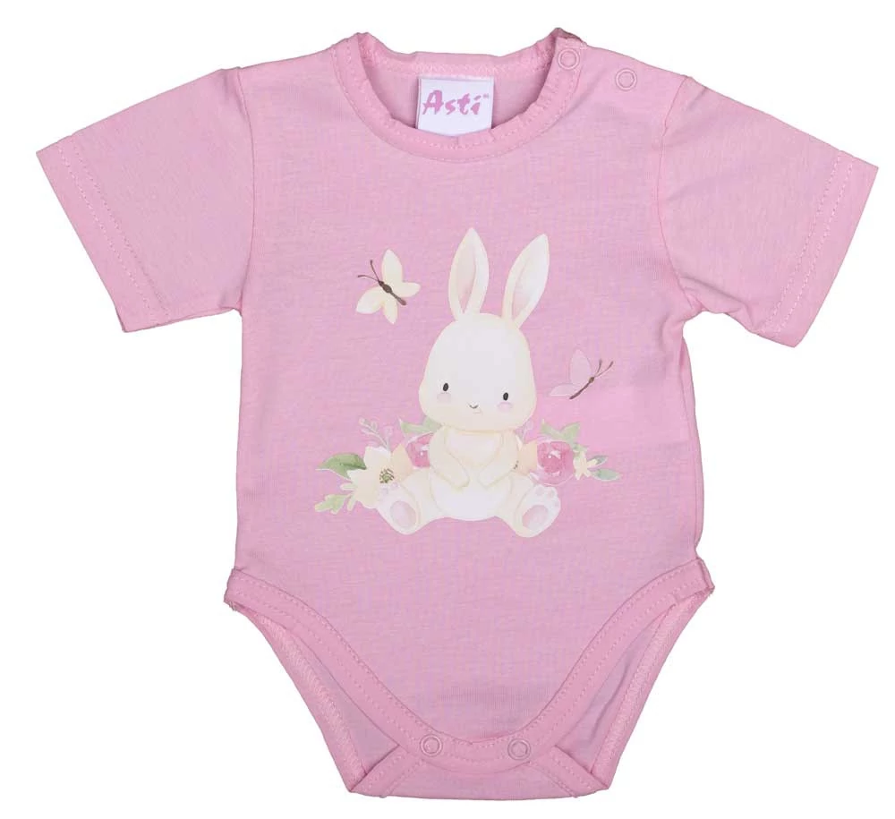 Rövid ujjú baba body cuki Nyuszi mintával A rózsaszínű, rövid ujjú baba body bájos nyuszi mintával varázsolja még édesebbé kisbabáját. A vidám nyuszis minta garantáltan mosolyt csal az arcára minden kisgyermeknek és szülőnek egyaránt. Kiváló választás lehet mindennapi viseletként, hiszen könnyen kombinálható más ruhadarabokkal. A 100% pamut anyagból készült body puha, kényelmes viseletet biztosít a baba érzékeny bőrének, miközben megóvja azt az irritációtól. A termék könnyen tisztítható, nikkelmentes patenttal készül, így az erre érzékeny babák bőrét sem irritálja. Válaszd ezt a minőségi magyar terméket, amely első osztályú minőségben készült, és öltöztesd babádat a legjobbba! Minőségi magyar termék Anyaga: 100% pamut, Minőség: I. osztály