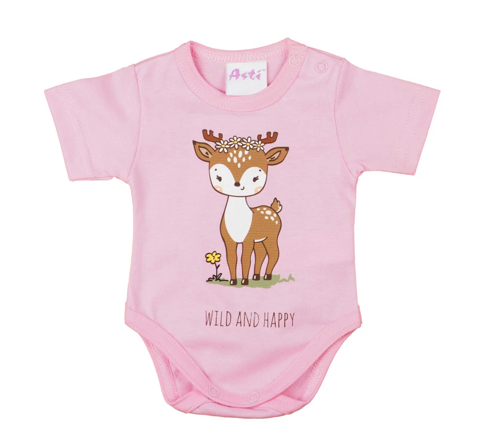 Varázsoljon egy mosolyt a picurka arcára ezzel a rózsaszín, rövid ujjú bodyval, melyet egy cuki Őzike minta díszít. Ez a kedves kis ruhadarab tökéletes választás a babáknak, hiszen jól kombinálható más darabokkal, és a kényelmet szem előtt tartva készült. A minőségi, 100% pamut anyag gondoskodik arról, hogy a bőrük se iritálódjon, miközben a nikkelmentes patentoknak köszönhetően az allergiás reakciók is a múlté. Ez a termék nem csak szuper kényelmes, de tisztítása is gyerekjáték, így az anyukáknak is nagy segítség. Büszkék vagyunk rá, hogy ez a minőségi termék Magyarországon készült, és tökéletesen megfelel az I. osztályú minőségi követelményeknek. Tegye boldoggá a picit, és öltöztesse bele ebbe a szuper cuki bodyba!