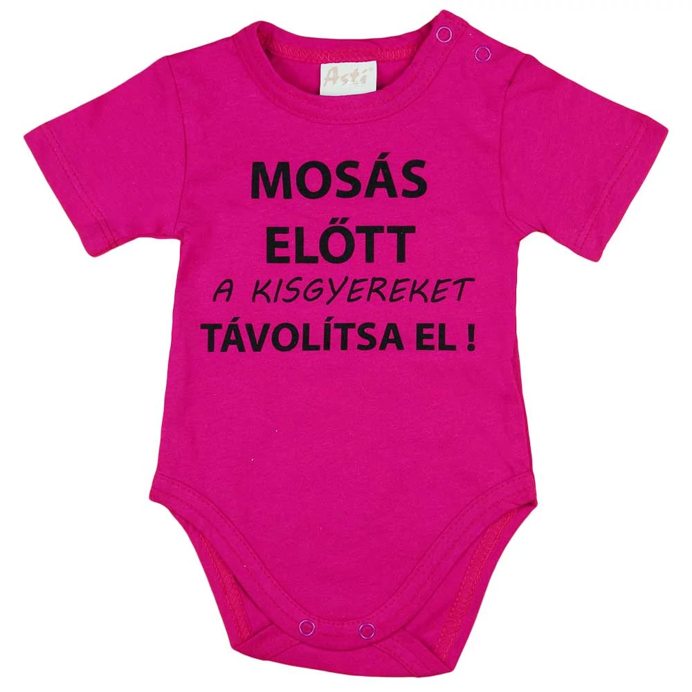 Rövid ujjú baba body "Mosás előtt a kisgyereket távolítsa el!" felirattal