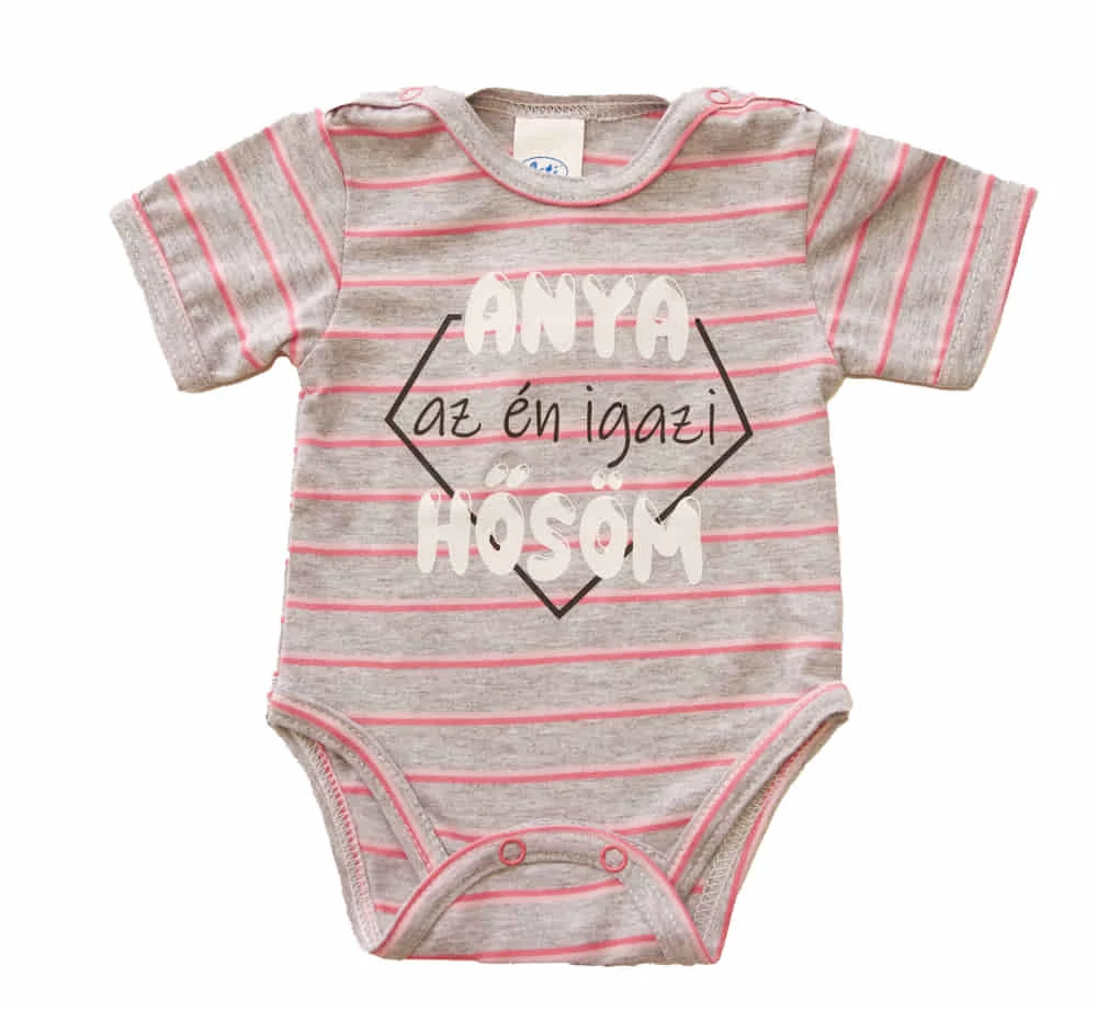 Kényeztesse pici babáját ezzel a puha, szürke csíkos, rövid ujjú baba bodyval, melyen az "Anya az én igazi hősöm" felirat olvasható. Kiváló minőségű, 100% pamut anyagból készült, kényelmes viselet minden napra. A vállnál és alul található dupla patentoknak köszönhetően a body könnyedén igazítható a baba növekedésének üteméhez. Minden anyuka szívéhez közel álló darab, ami tökéletes ajándék lehet bármely alkalomra. Magyarországon készült, I. osztályú termék, mely biztosítja a legmagasabb minőséget és tartósságot. A termékben használt patentok nikkelmentesek, így azok nem váltanak ki allergiás reakciót az erre érzékeny babáknál. Szerezze be ezt a szeretetteljesen készült, praktikus és stílusos bodyt, hogy babája mindig kényelmesen és divatosan érezhesse magát.