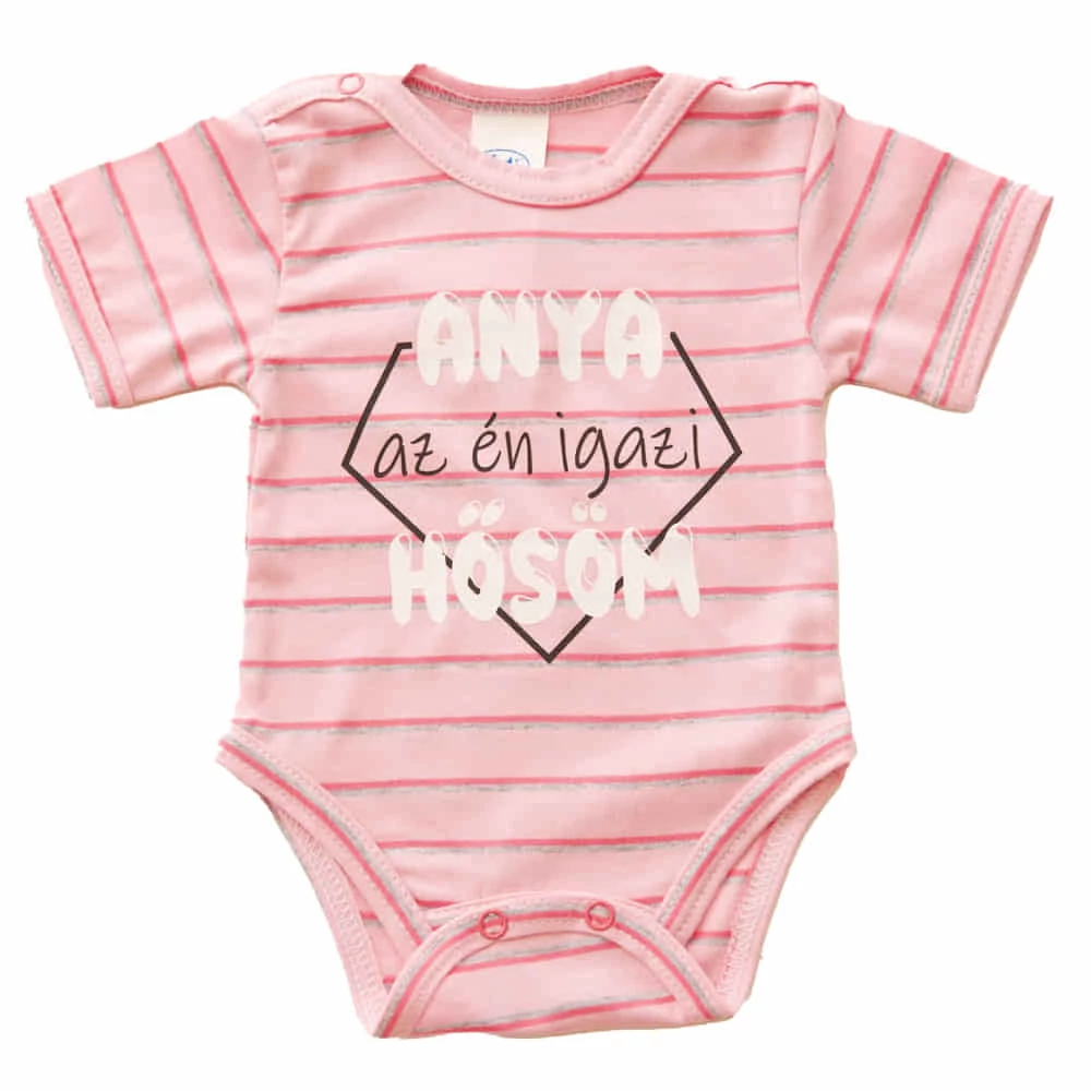 Öltöztesd a kisbabádat ebbe a csodálatos rózsaszín csíkos, rövid ujjú bodyba, melyen a "Anya az én igazi hősöm" felirat hirdeti szeretetedet a világ felé! A body vállánál mindkét oldalon, illetve alul dupla patenttal rendelkezik, így könnyedén igazíthatod a méretet a baba növekedéséhez. Készült 100% pamutból, így extra puha és kényelmes viseletet biztosít a kicsiknek. Minőségi magyar termék, melyet szívvel-lélekkel terveztek és készítettek. Nikkelmentes patentja biztosítja, hogy még az érzékeny bőrű babák is nyugodtan hordhatják, hiszen nem vált ki allergiás reakciót. Szánj rá egy pillantást, és tedd boldoggá a kisbabádat ezzel a kedves és praktikus bodyval!