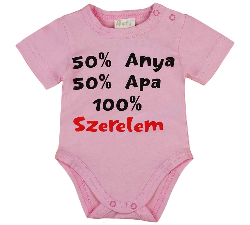 A cuki rövid ujjú feliratos baba body tökéletes választás a kicsiknek. Rózsaszín színével igazán szemrevaló, és a felirat még egyedibbé teszi. A vállon található patentok megkönnyítik a fel- és levételt, így a pelenkázás is gyerekjáték lesz. Természetesen a minőségre is nagy gondot fordítottunk: 100% pamutból készült, és I. osztályú minőségű. A bodysuitet a Magyarországon működő Andrea Kft. gyártja, tehát ha minket választasz, a hazai termelést is támogatod. És hogy a babád biztonságban legyen, a terméken található összes patent nikkelmentes, így az erre érzékeny babák sem lesznek allergiásak tőlük. Válaszd ezt a csodás baba bodyt, és öltöztesd a babádat stílusosan, kényelmesen és biztonságosan!
