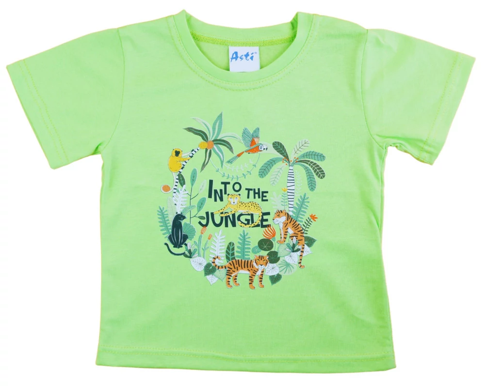 Rövid ujjú fiú póló dzsungel mintával Egy igazi kis dzsungel rajongónak nélkülözhetetlen darab ez a rövid ujjú fiú póló, amelyen kedvenc állatai díszelegnek. Az zöld színű póló kiváló minőségű, 100% pamut anyagból készült, ami garantálja a hosszú élettartamot és a viseleti kényelmet. A vidám minta pedig minden kisfiú arcára mosolyt csal. Büszkén mondhatjuk, hogy ez a póló magyar termék, melyet első osztályú minőség jellemzi. Hagyd, hogy gyermeked szabadon kifejezze rajongását az állatok iránt ezzel a laza, vidám pólóval! Minőségi magyar termék Anyaga: 100% pamut Minőség: I. osztály