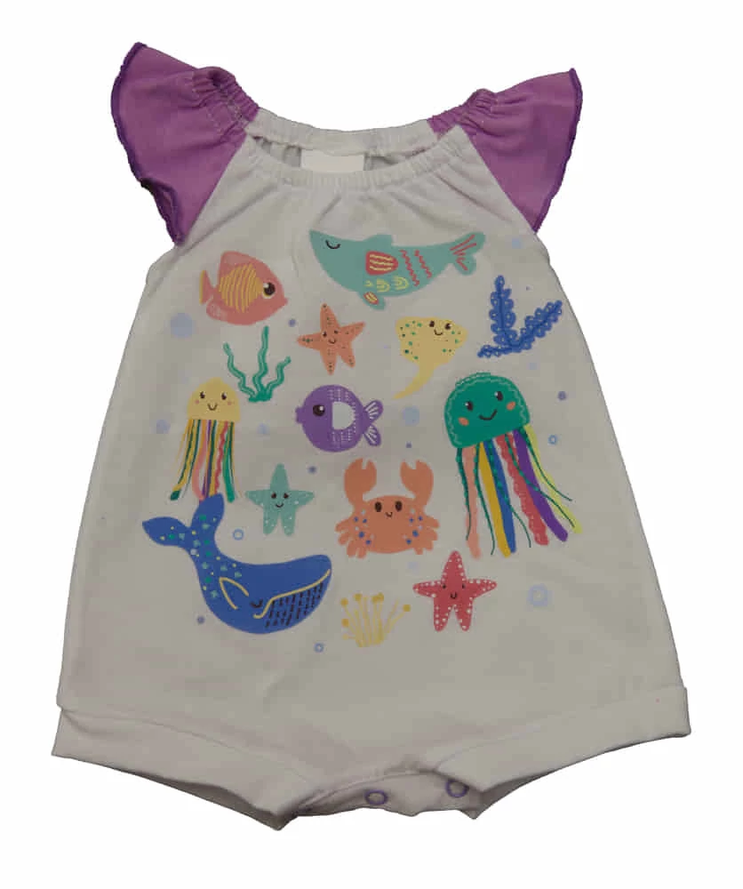 Ezzel a rövid ujjú kislány baba napozóval a kis hercegnőd a legcukibb lesz a strandon! A lila színű, minőségi pamutból készült napozó kényelmes viseletet biztosít a kicsiknek egész napra, míg a fodros ujjak és a tengeri állatok mintája igazán egyedivé teszi. A gyors pelenkázást segítő, nikkelmentes patentokkal ellátott napozó kiváló választás forró nyári napokra. A tengeri állatok mintája garantáltan mosolyt csal mindenki arcára. Ne hagyja ki ezt a minőségi, Magyarországon készült terméket, amely nem csak stílusos, de allergiás reakciót sem vált ki a babáknál. Az anyag 100% pamut, így az I. osztályú minőség garantált.