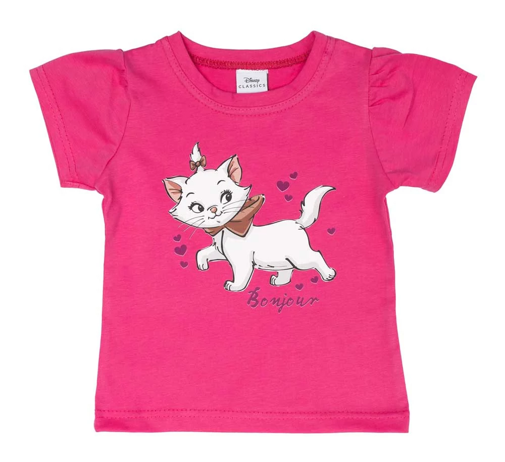 Rövid ujjú kislány póló Marie cica mintával Eredeti Disney termék Rövid ujjú kislány póló enyhén rugalmas pamut anyagból. Praktikus alapdarabja kislányunk ruhatárának, amit nadrággal, szoknyával is viselhet. Az elején aranyos Marie cica mintával nyomva, ami garantálja, hogy kislányunk is szeretni fogja. Minőségi, könnyen kezelhető, szín- és formatartó anyagból készült. Minőségi magyar termék Anyaga: 100% pamut, Minőség: I. osztály