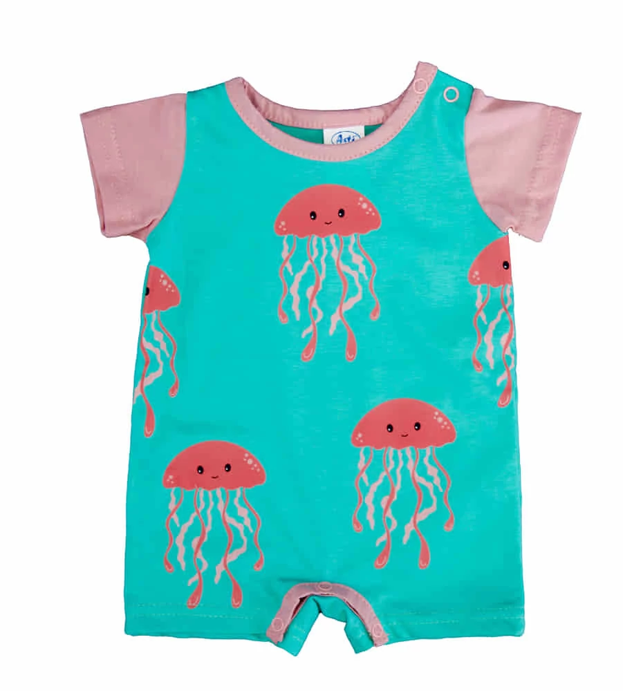Gyöngyöző, menta színű, rövid ujjú baba napozó, melyet egy játékos medúza mintával díszítettünk. A finom, rugalmas pamut anyag nemcsak kellemes tapintású, de a baba mozgását sem korlátozza, így akár egész napos viseletre is ideális. A vállán és a lába között található patentok praktikusak, megkönnyítve az öltöztetést és a peluscserét. Ez a napozó nemcsak stílusos, de kiváló minőségű magyar termék, melyet 100% pamutból készítettünk. I. osztályú minőség, melynek részleteiben a gondos tervezés és a kiváló minőségű kivitelezés tükröződik. De nem csak a minőség miatt választják sokan ezt a terméket. Fontos szempont a baba egészsége is, ezért a napozót nikkelmentes patenttal készítjük. Így azok a babák is bátran viselhetik, akik érzékenyek a fémre, hiszen a patent nem vált ki allergiás reakciót.