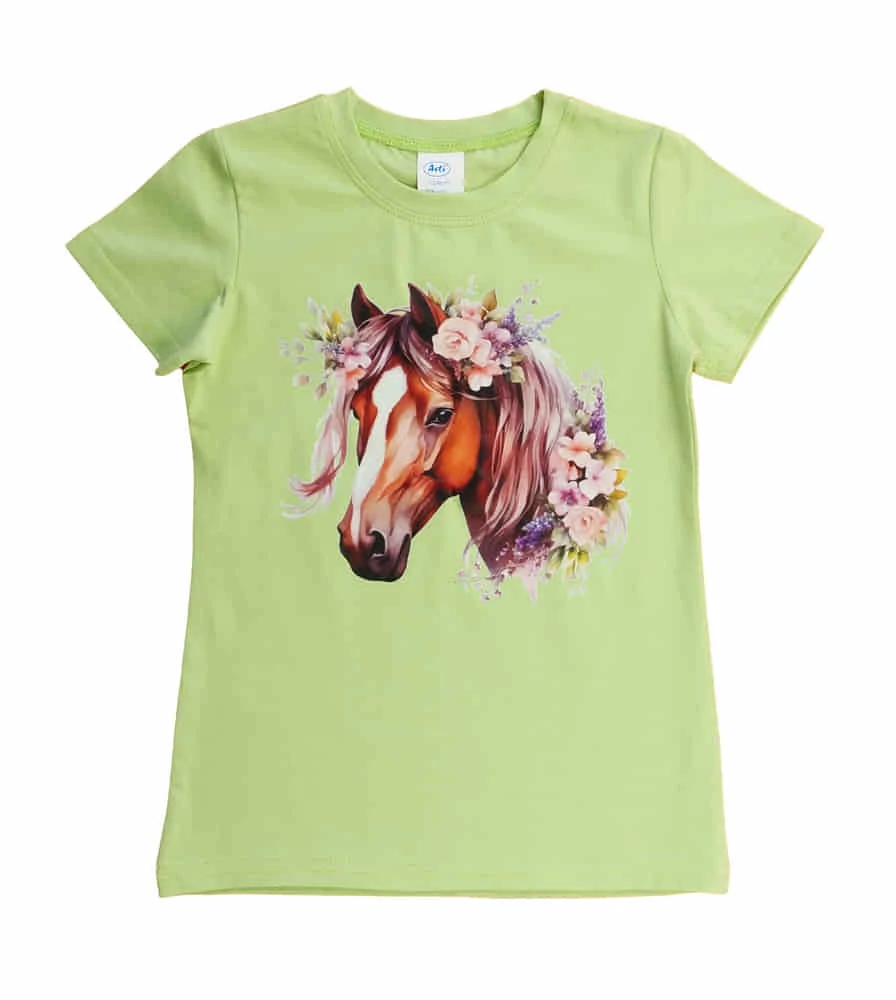 Rövid ujjú póló, Lovas mintával Ez a rövid ujjú kislány póló tökéletes választás a mindennapokra! Kiváló minőségű, elasztikus pamut anyagból készült, amely kellemesen puha és légáteresztő, így egész nap kényelmes viseletet biztosít. Klasszikus szabása és rugalmas anyaga szabad mozgást enged, miközben formatartó kialakítása garantálja, hogy mosás után is megőrzi alakját és színét. A vidám szín és a vagány minta igazán csajos és trendi megjelenést kölcsönöz. Könnyen kezelhető, így praktikus választás aktív gyerekek számára! Anyaga: 90% Pamut – 10% Elasztán Minőség: I. osztály Minőségi magyar termék!