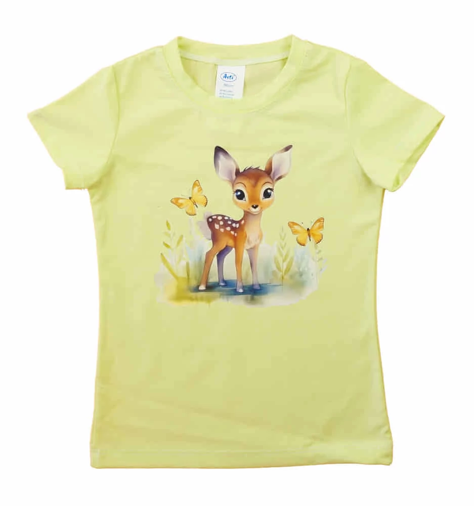 Rövid ujjú póló, Őzike mintával Ez a rövid ujjú kislány póló tökéletes választás a mindennapokra! Kiváló minőségű, elasztikus pamut anyagból készült, amely kellemesen puha és légáteresztő, így egész nap kényelmes viseletet biztosít. Klasszikus szabása és rugalmas anyaga szabad mozgást enged, miközben formatartó kialakítása garantálja, hogy mosás után is megőrzi alakját és színét. A vidám szín és a vagány minta igazán csajos és trendi megjelenést kölcsönöz. Könnyen kezelhető, így praktikus választás aktív kisgyerekek számára! Anyaga: 90% Pamut – 10% Elasztán Minőség: I. osztály Minőségi magyar termék!