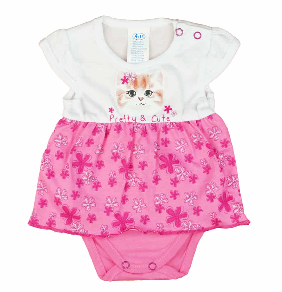 A rövid ujjú, szoknyás baba body nem csupán alapvető ruhadarab minden kisbaba szekrényében, de a rajta lévő cuki virágos cica mintával igazán különlegessé teszi a mindennapi viseletet. A fehér színű, színes mintával díszített body minden más ruhadarabbal könnyedén kombinálható, így mindig stílusos lesz a kis jövevény. A body 100% pamutból készült, amely a legkényelmesebb anyag a babák érzékeny bőrének. Az anyag nem irritálja a bőrt, így a picik egész nap jól érzik magukat benne. A tisztítása is egyszerű, így a szülőknek nem kell aggódniuk a baba ruháinak tisztán tartása miatt. Az egyenletes minőség érdekében a termék Magyarországon készült, I. osztályú minőségben. A body nikkelmentes patenttal készül, így nem vált ki allergiás reakciót az erre érzékeny babáknál. A cuki virágos cica minta pedig garantáltan mosolyt csal mindenki arcára.