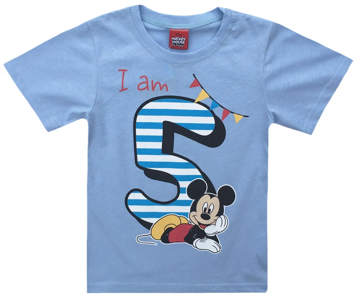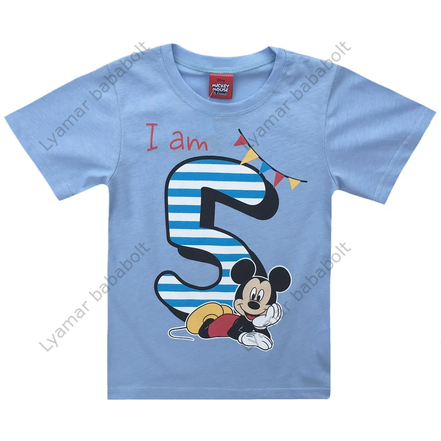 Mickey Mouse mintával díszített rövidujjú póló, 5. szülinapra, a póló felirata miatt egész évben hordható,