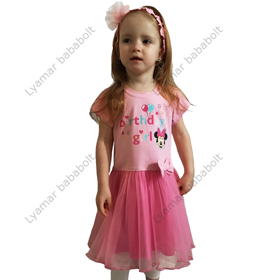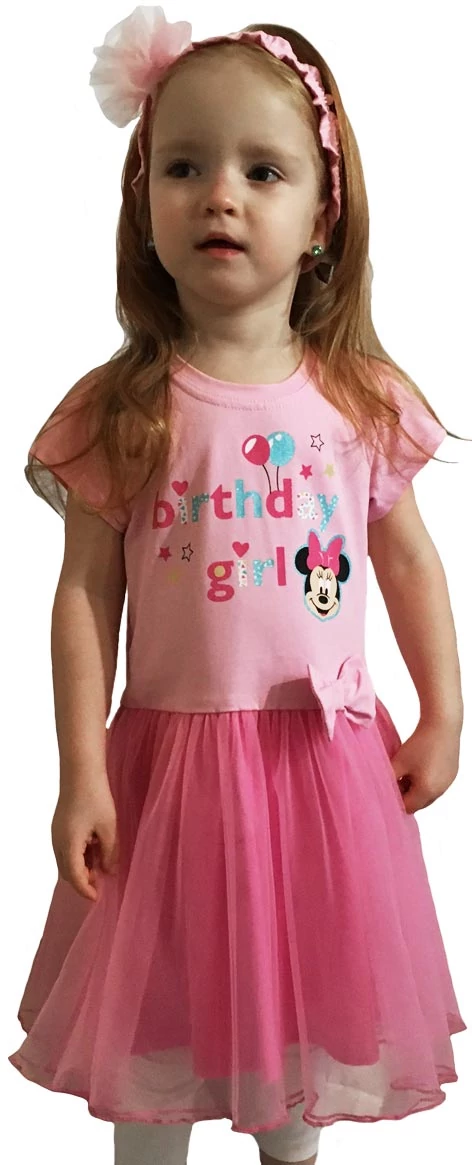 A szett 1 db tüllös alkalmi születésnapi Minnie ruhából és 1 db tüllös fejpántból áll.