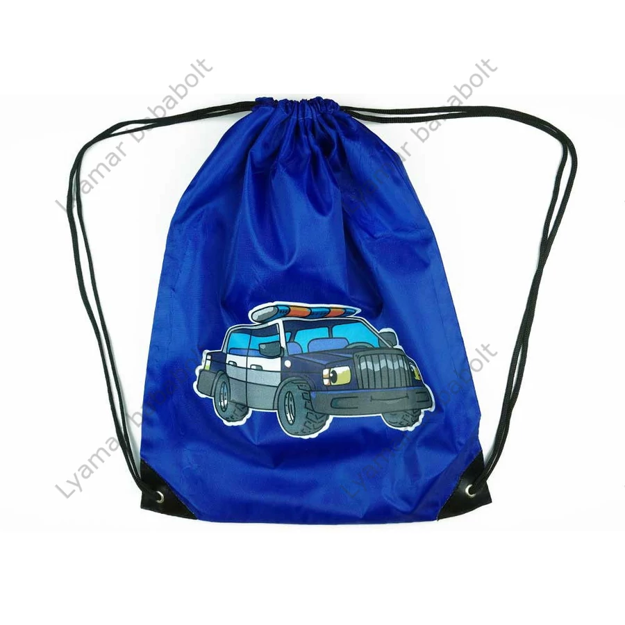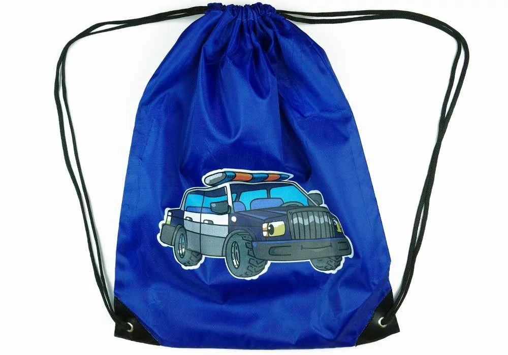 Rendőrautós mintával nyomott zsinóros tornazsák.