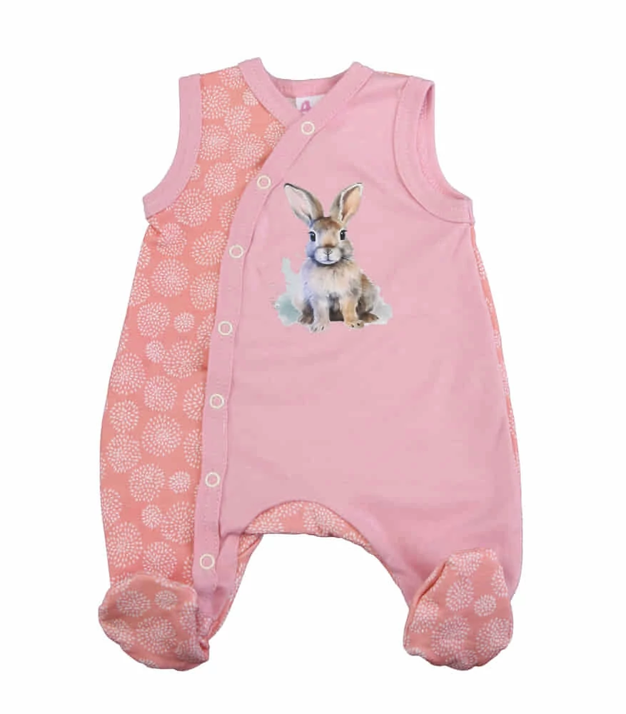 Ujjatlan baba rugdalózó Nyuszi mintával Ujjatlan baba rugdalozó, minden baba ruhatárának alapdarabja. Elöl és a lábközött is patentos, ami megkönnyíti a pelenkázást és az öltöztetést is. Nagyon szép mintája van elejét cuki mókus díszíti. Baba barát anyagból készült. Tökéletes viselet hűvösebb időben egy kombival kiegészítve lehet hordani. Könnyen kezelhető jól mosható, szín és formatartó. Minőségi magyar termék Anyaga: 90% pamut, 10% elasztán Minőség: I. osztály