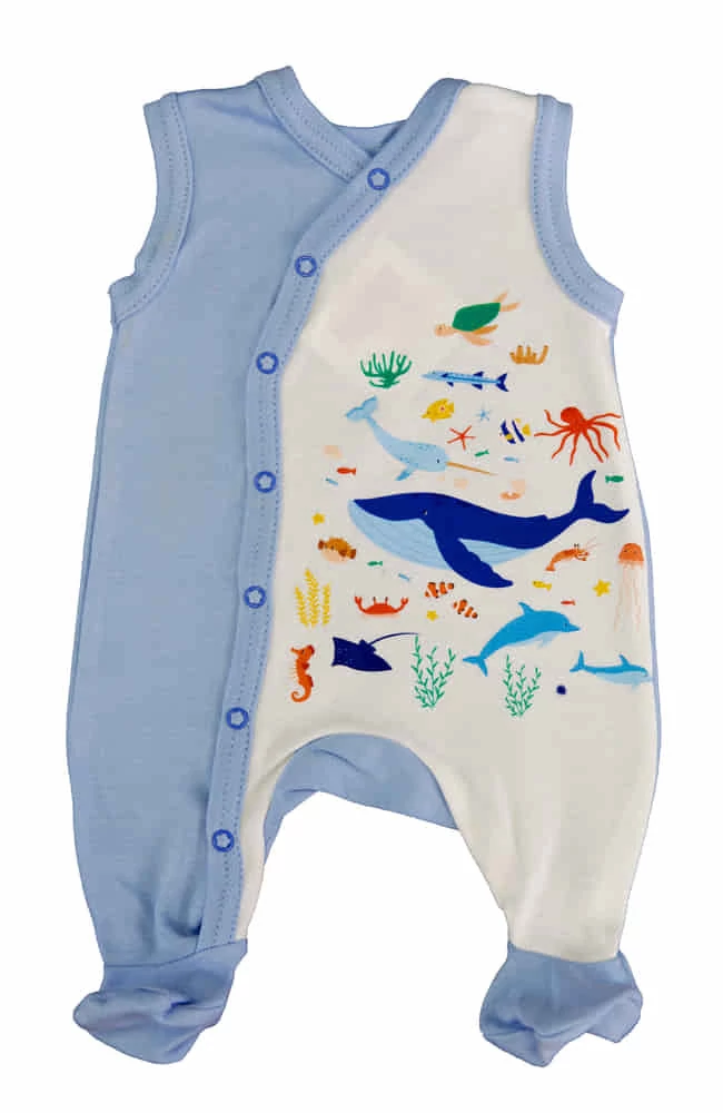 Az ujjatlan baba rugdalózónk a Tengeri állatok mintával egy igazi kincs a kis hercegnők számára. Világoskék színével és vidám mintájával minden napot feldob. Kényelmes és praktikus viselet, amely az első napoktól kezdve fontos része lesz a kicsi ruhatárának. A rugdalózó elől és a lábközött is patentos, így a pelenkázás és az öltözködés is gyerekjáték lesz. A 100% baba barát pamut anyagból készült rugdalózó hűvösebb időben is tökéletes választás, akár egy kis kombival kiegészítve. Mosás után is megőrzi színét és formáját, könnyen kezelhető és jól mosható. Bízzon a minőségben és válassza ezt a magyar terméket, amelynek minden részletében a kisbabák igényeit tartottuk szem előtt. Anyag: 100% pamut. Minőség: I. osztály.