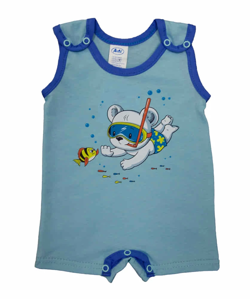 Hűsítő kékben pompázó, 100% pamutból készült napozónk ujjatlan kialakítása miatt tökéletes választás a nyári meleg napokra. Mintája minden bizonnyal felkelti majd a kicsik érdeklődését, hiszen a búvárra emlékeztető maci imádnivalóan cuki. A minőségi, puha, bababarát anyag biztosítja a kényelmet, miközben követi a baba alakját és maximális mozgásszabadságot biztosít. A vállán és a lába között található patentok megkönnyítik az öltöztetést, a pelenkacsere idejét és ezzel együtt a szülők mindennapjait is. A nikkelmentes patentok garantálják, hogy a bőrrel érintkezve semmilyen allergiás reakciót nem váltanak ki. Bízunk benne, hogy ez a minőségi magyar termék, ami első osztályú minőségű, hosszú távon is bizonyítani fog a baba ruhatárában.