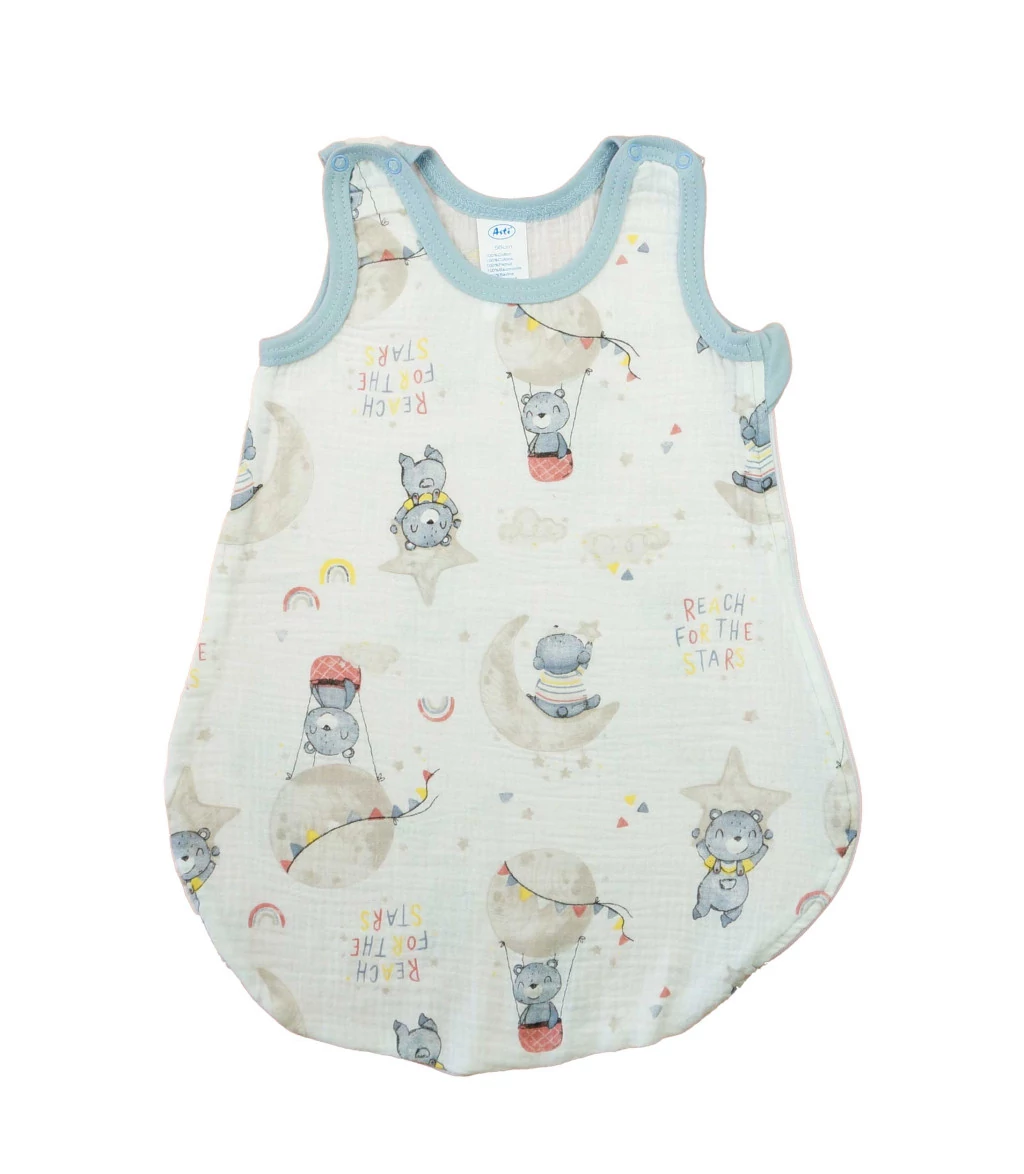 Ujjatlan vékony hálózsák Macis mintával 1 TOG Öltöztesse álomba kisbabáját ebben az maci mintás, ujjatlan hálózsákban! Az oldalt cipzáras, vállon patentos kialakításnak köszönhetően könnyedén felvehető és levehető, így az éjszakai pelenkázás sem lesz gond. A hálózsák 100% pamut anyagból készült, ami puha érintésű és légáteresztő, így a baba éjjel-nappal kényelmesen és biztonságosan tud majd aludni. A minőségi magyar termék érzékeny bőrű babák számára is ideális, hiszen nikkelmentes patenttal készült, ami nem vált ki allergiás reakciót. A 1 TOG értékű hálózsák tökéletes választás melegebb hónapokra. Segítünk a választásban: táblázatunk segítségével könnyedén kiválaszthatja a megfelelő hálózsákot az évszaktól és a hőmérséklettől függően.
