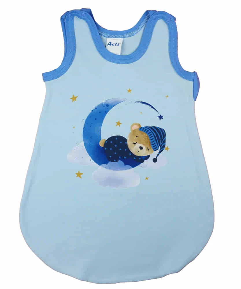 Öltöztesse álomba kisbabáját ebben a világoskék, macis mintás, ujjatlan hálózsákban! Az oldalt cipzáras, vállon patentos kialakításnak köszönhetően könnyedén felvehető és levehető, így az éjszakai pelenkázás sem lesz gond. A hálózsák 100% pamut anyagból készült, ami puha érintésű és légáteresztő, így a baba éjjel-nappal kényelmesen és biztonságosan tud majd aludni. A minőségi magyar termék érzékeny bőrű babák számára is ideális, hiszen nikkelmentes patenttal készült, ami nem vált ki allergiás reakciót. A 1 TOG értékű hálózsák tökéletes választás melegebb hónapokra. Segítünk a választásban: táblázatunk segítségével könnyedén kiválaszthatja a megfelelő hálózsákot az évszaktól és a hőmérséklettől függően.