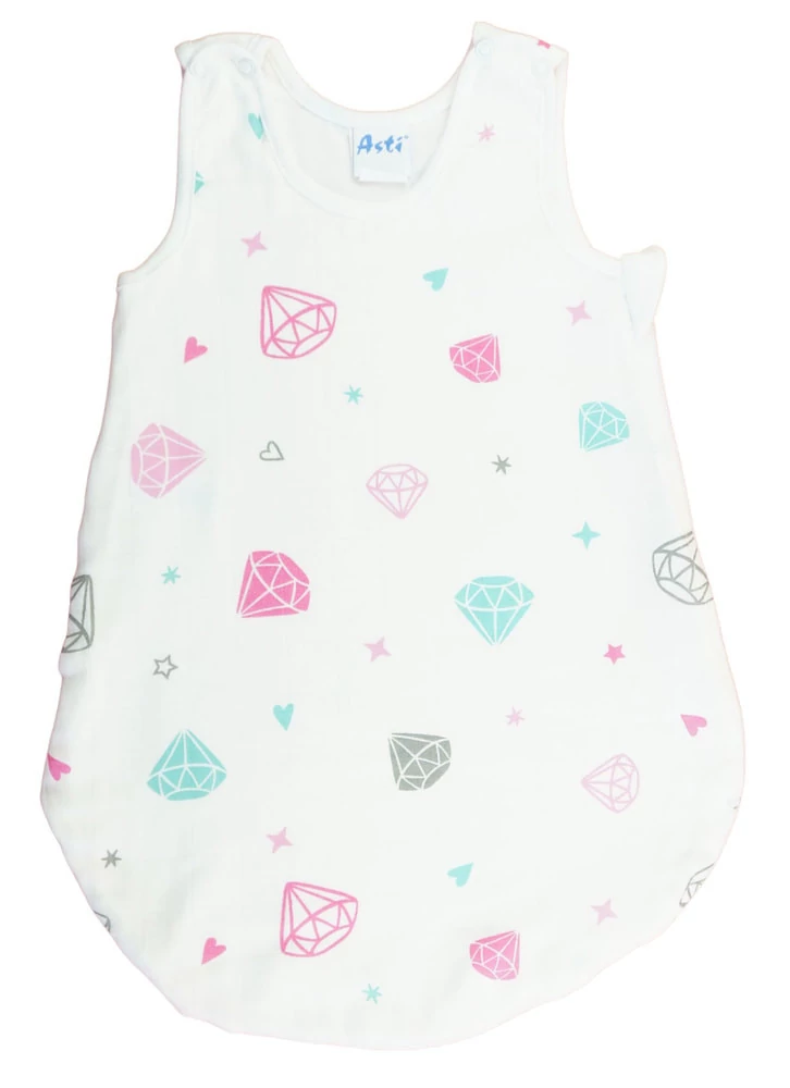 Ujjatlan vékony tetra hálózsák Gyémánt mintával 1 TOG Öltöztesse álomba kisbabáját ebben a gyémánt mintás, ujjatlan hálózsákban! Az oldalt cipzáras, vállon patentos kialakításnak köszönhetően könnyedén felvehető és levehető, így az éjszakai pelenkázás sem lesz gond. A hálózsák 100% pamut tetra anyagból készült, ami puha érintésű és légáteresztő, így a baba éjjel-nappal kényelmesen és biztonságosan tud majd aludni. A minőségi magyar termék érzékeny bőrű babák számára is ideális, hiszen nikkelmentes patenttal készült, ami nem vált ki allergiás reakciót. A 1 TOG értékű hálózsák tökéletes választás melegebb hónapokra. Segítünk a választásban: táblázatunk segítségével könnyedén kiválaszthatja a megfelelő hálózsákot az évszaktól és a hőmérséklettől függően.