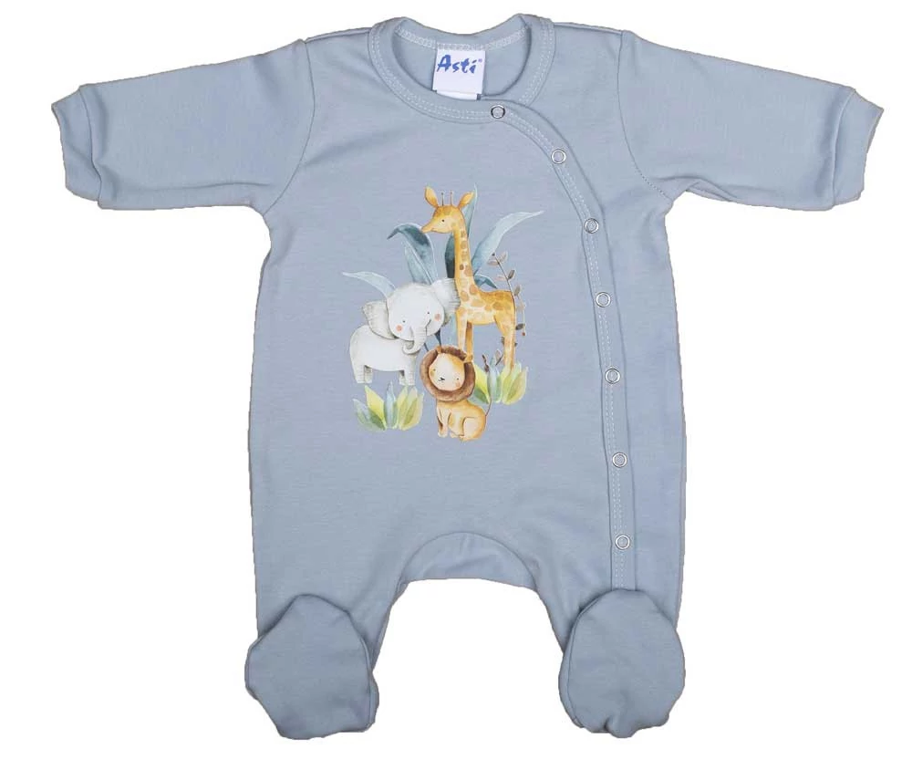 Vékony, pamut, elöl patentos kisfiú rugdalózó Szafaris mintával