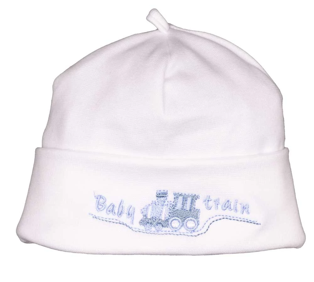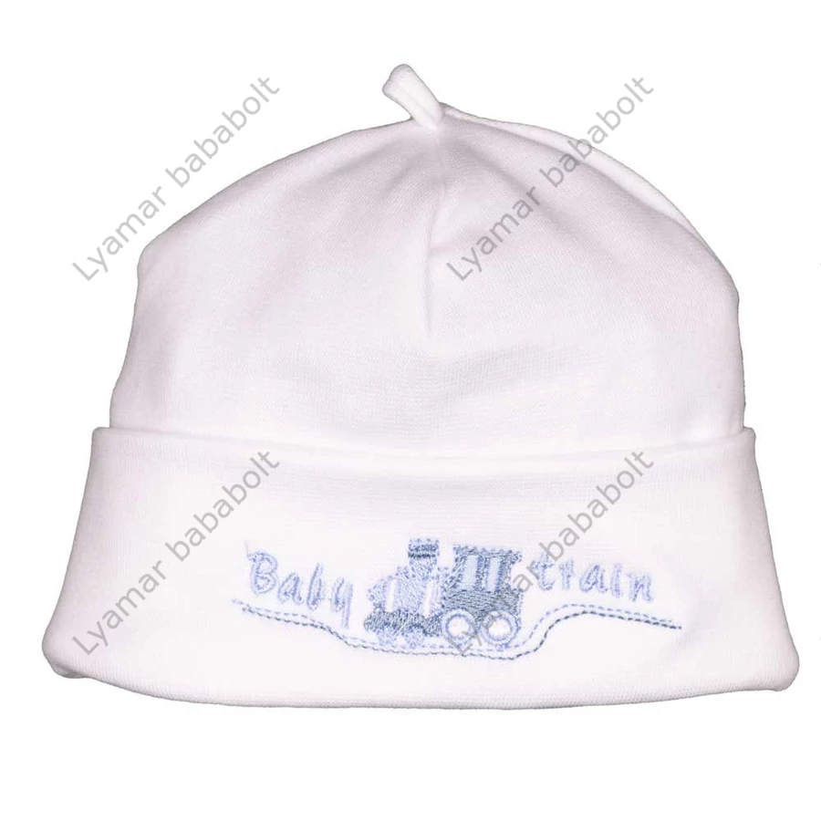 Vonat mintás, fülvédős, megkötős baba sapka Vonat mintával hímzett, fülvédős, megkötős, vékony pamut, baba sapka Anyaga: 97% Pamut, 3% elsztán Minőség: I. osztály Magyar gyártású termék